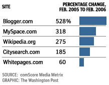 But in all seriousness, these data (see table on the right) from comScore MediaMetrix, published by the Washington Post, prove that Web 2.0 is real. Websites with user generated content, like Blogger.com, Wikipedia.org or MySpace.com are showing three-digit growth figures (in number of visitors) in the last year. And localized content, like Citysearch.com or Whitepages.com, is also growing fast. (hat tip)