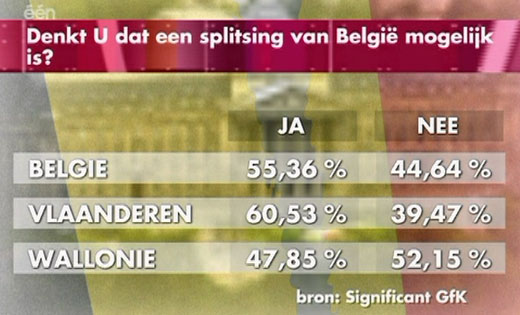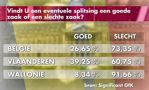 woensdag, 5 september, 2007 - 10:46Voor wie peilingen ernstig neemt: bij de bevolking is noch nationaal, nog binnen de regio of taalgroep een merderheid gewonnen voor de splitsing van België.