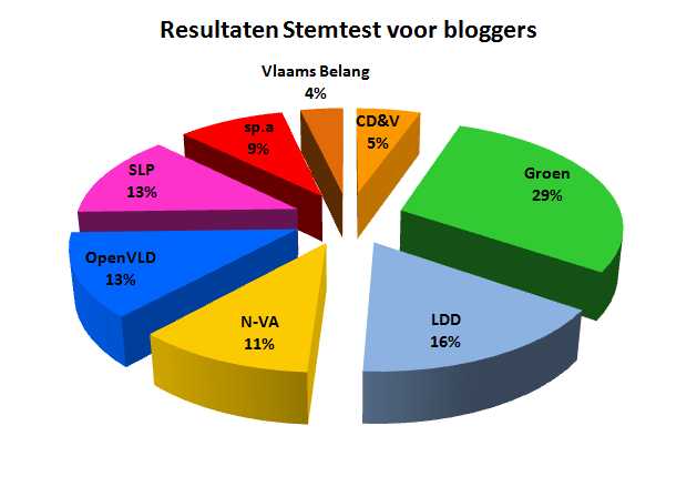 De VRT en De Standaard hebben begin deze maand de Stemtest gelanceerd, een test die op basis van 36 vragen visueel voorstelt hoe je antwoorden passen bij de Vlaamse partijen. (...) Ondertussen zijn er nog enkele bloggers die hun resultaten eveneens bekend gemaakt hebben. (...) Het is maar de vraag of de 55 bloggers waarop dit onderzoekje gebaseerd is representatief zijn voor de ganse Vlaamse blogosfeer, of laat staan het Vlaams kiespubliek.